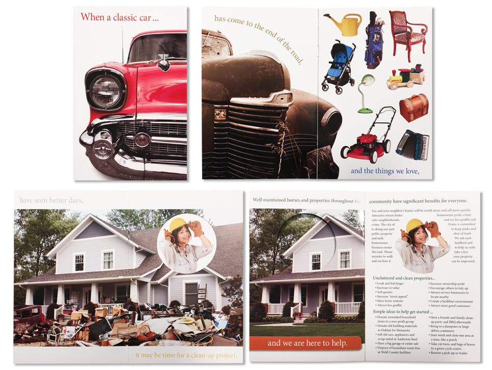 I notice several of these, and others on the brochure page, are pretty busy. That is usually because the client has too many goals for the size of the printed piece. Anvil Graphics is very good at organizing a customer’s text, editing and developing an overall plan to present all the content in an orderly way. A brochure, direct mail or presentation folder are very different in your hand then as an image here. We cutout small mockups of the concept, and use them to study the flow of information and images, so the finished piece is cohesive and flows well. Nowadays the emphasize is on simpler print items with the goal to QR code people to a more informative web page. Below is a “busy” but beautifully designed small brochure for the Animal Clinic, with excellent information flow and organized panels.